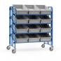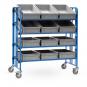 Baukasten-System. Stahlrohr- und Profilstahlgeschweißt, pulverbeschichtet blau RAL 5007, Schraubenkonstruktion. Ausführung wie 2895 mit zusätzlich 12 Stück Eurokästen 600 x 400 x 145 mm.