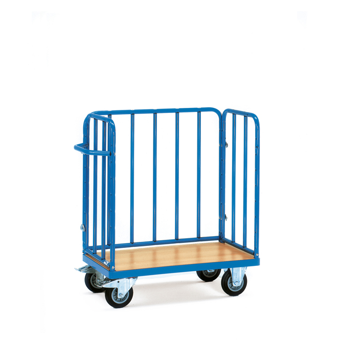 2 Lenk- und 2 Bockrollen, Naben mit Rollenlager. Feststeller an den Lenkrollen gemäß der Europäischen Norm EN-1757-3 (Sicherheit von Plattformwagen)